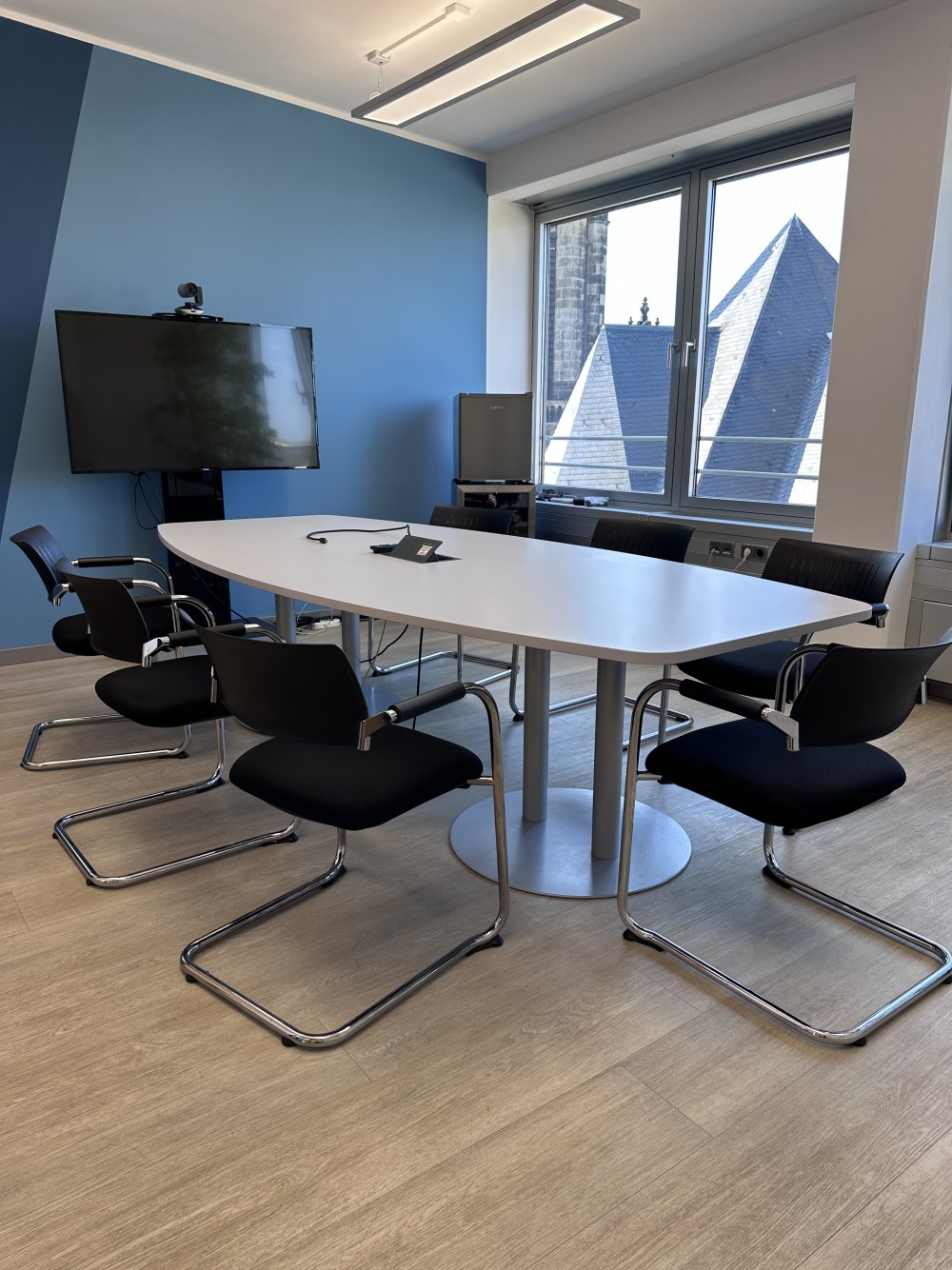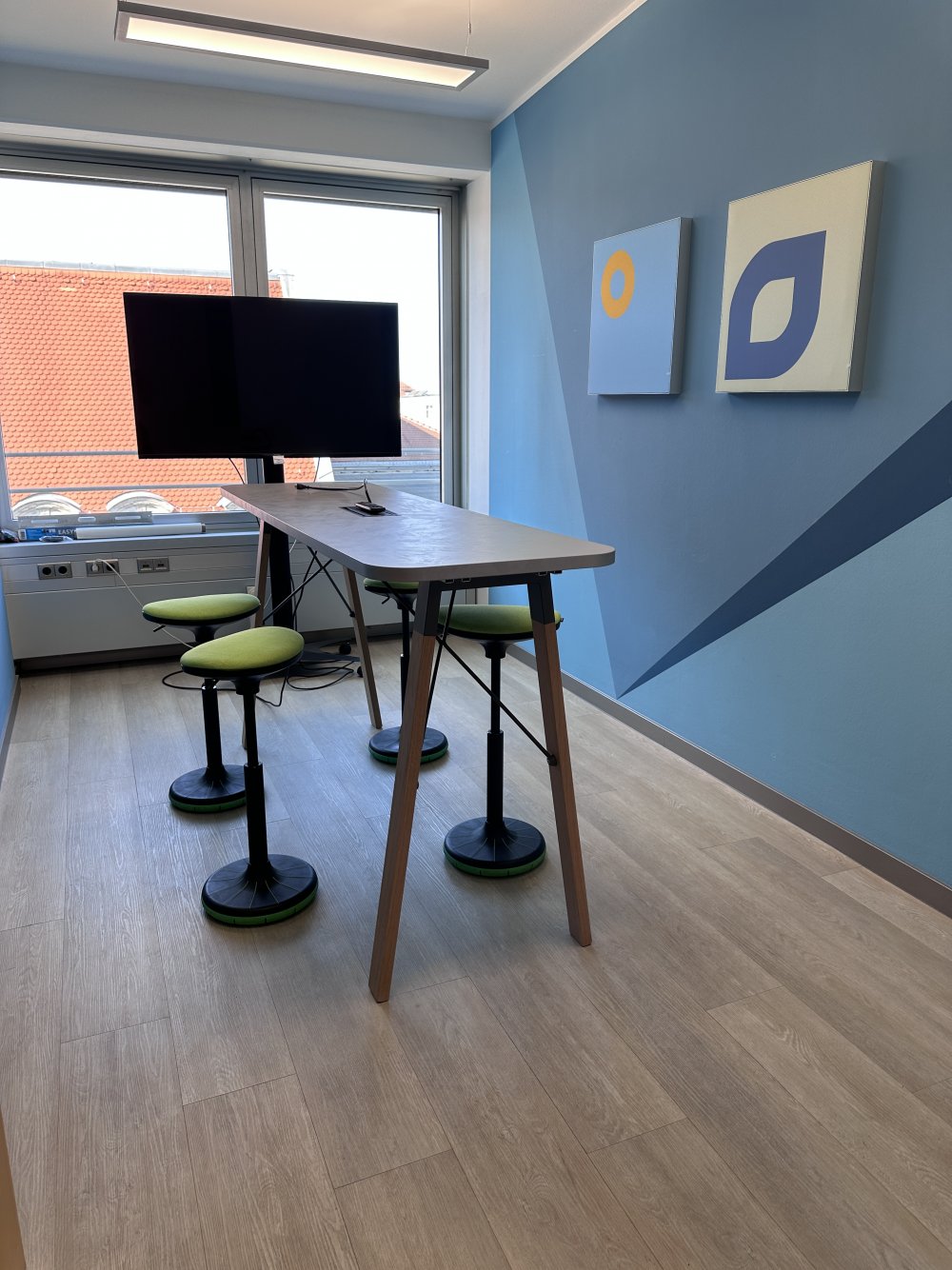 Zurück am Empfang, rechts abgebogen: Hier befindet sich zunächst unser Kontrollraum, ein Ort voller Kabel, Technik und Bildschirme, in dem auch unser Server steht. Ein paar Schritte weiter öffnet sich unser großer Konferenzraum hinter Glastüren, in dem regelmäßig Kundenmeetings, Präsentationen und interne Abstimmungen stattfinden. Direkt gegenüber liegt unsere Küche mit einem großen Esstisch. Die Küche ist ein zentraler und beliebter Treffpunkt für die Mittagspause. Hier wird gemeinsam gegessen, gelacht und sich ausgetauscht.